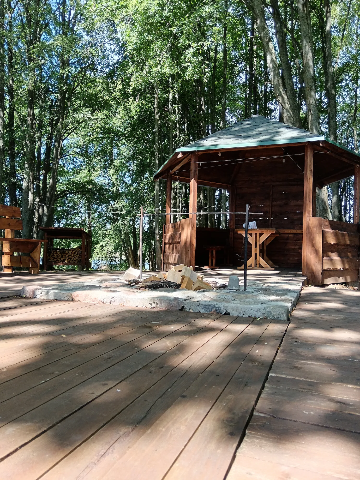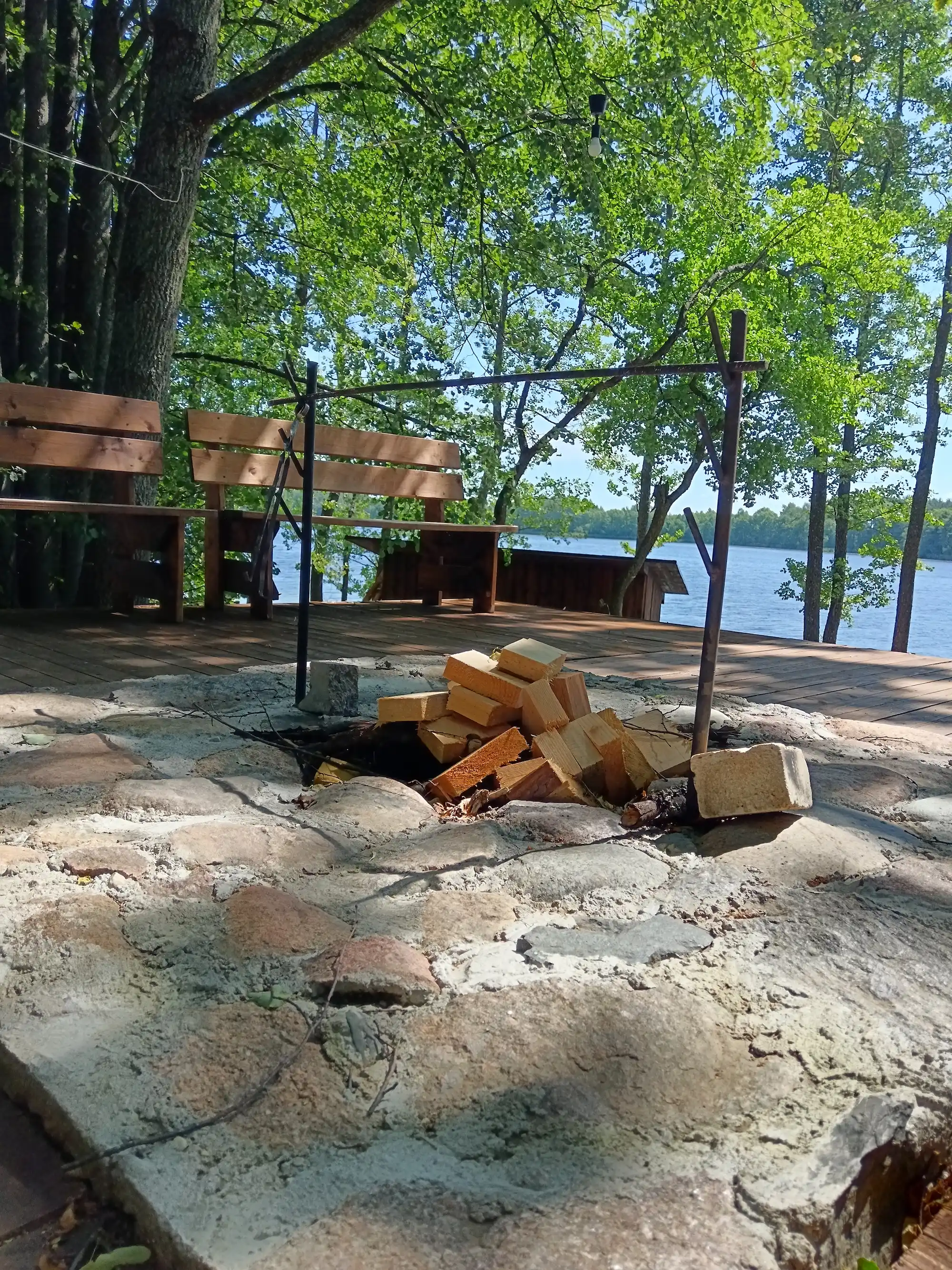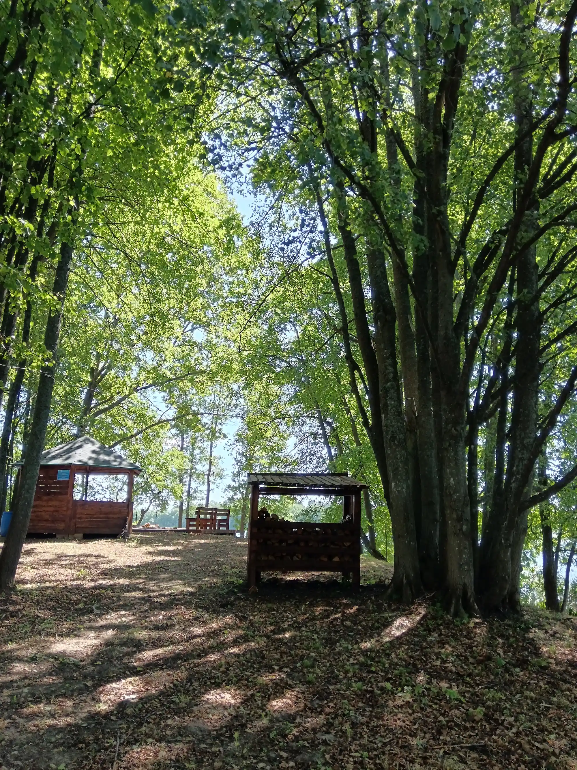 Абсталявана альтанкай, туалетам, вогнішчам з крамамі, пірсам, смеццезборнікам, сушкай для дроў, падстрэшкам для дроў, дровамі. Ёсць святло.