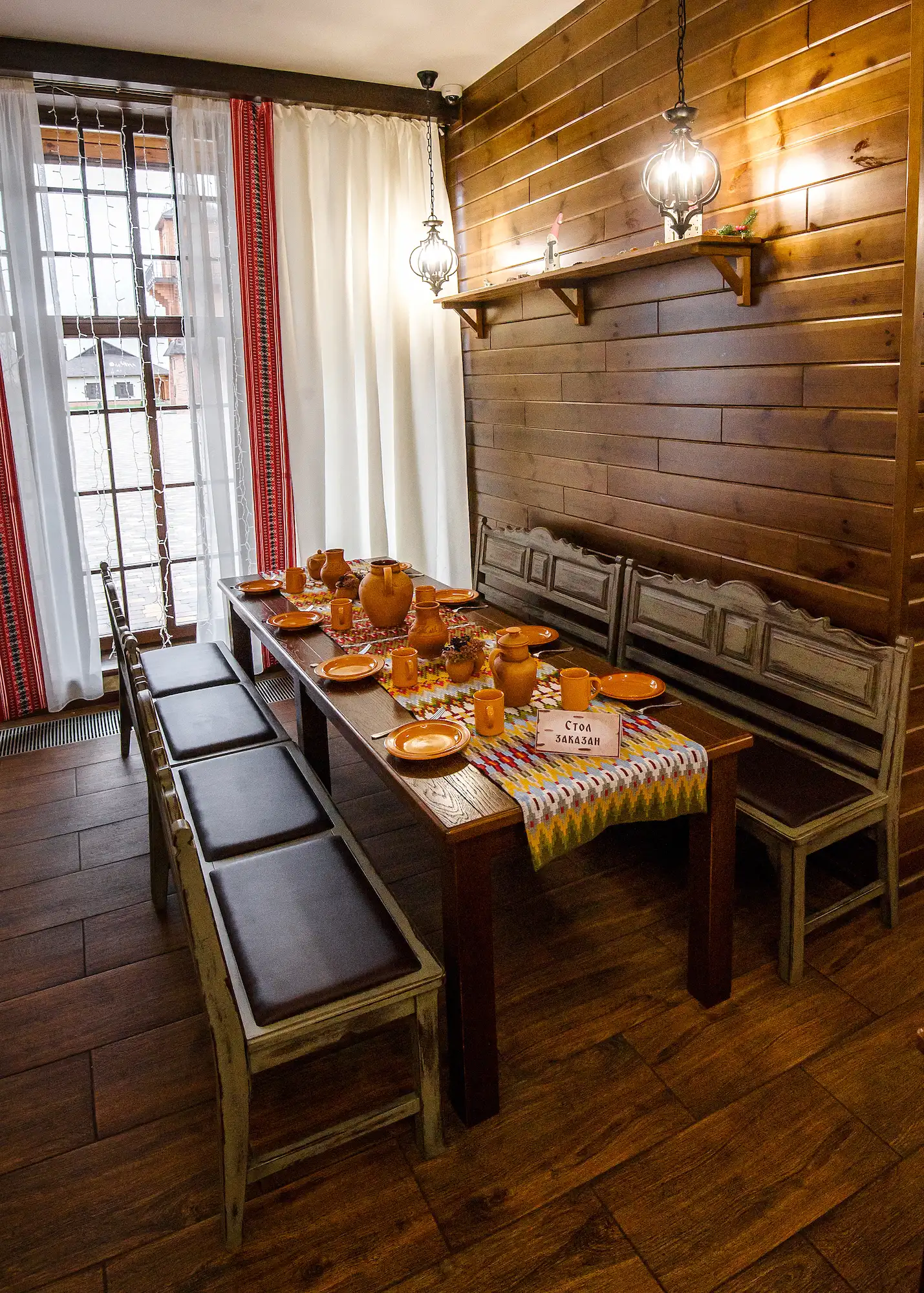 Вход в ресторан «Над Припятью» с вывеской и оформлением.