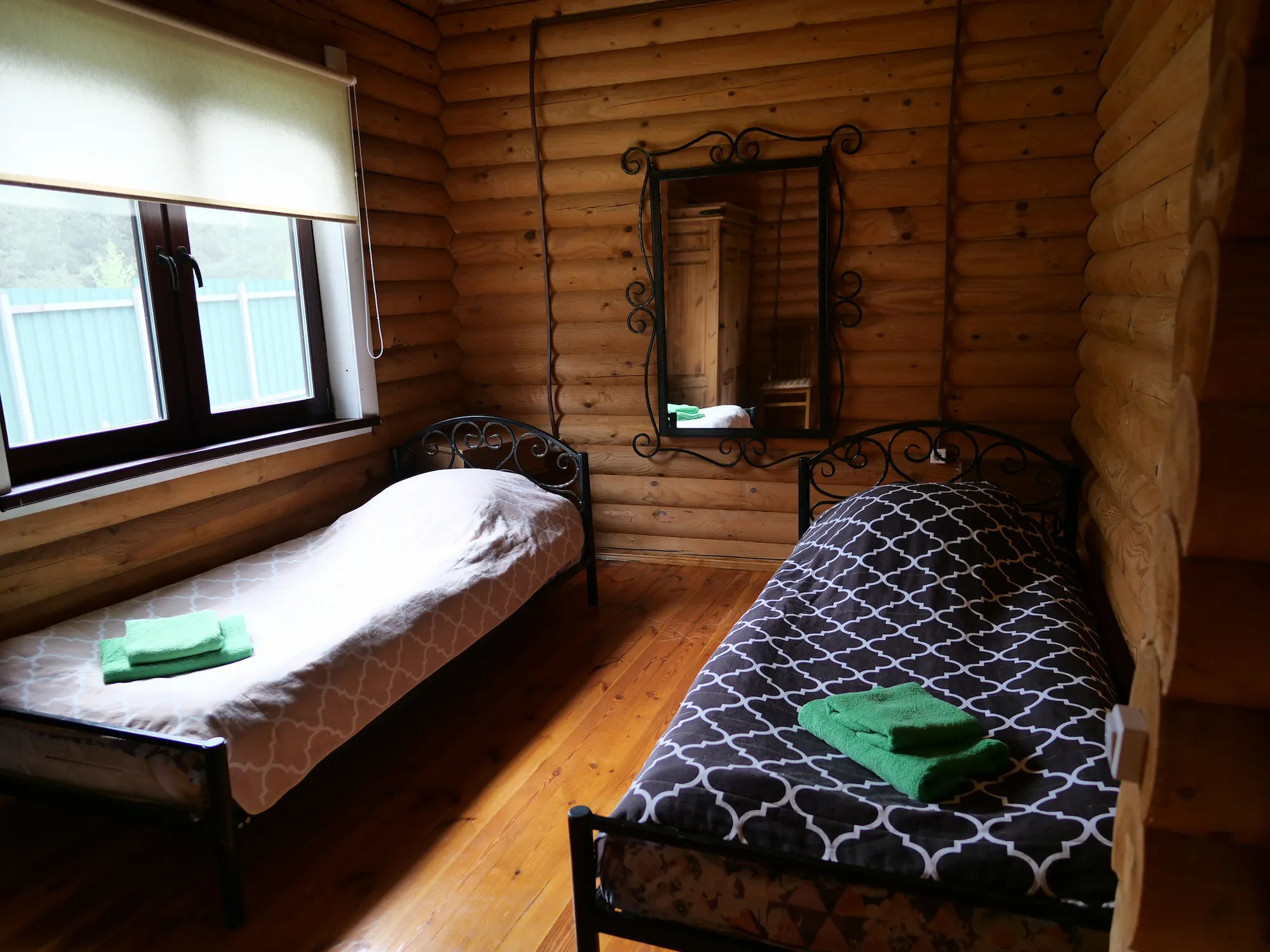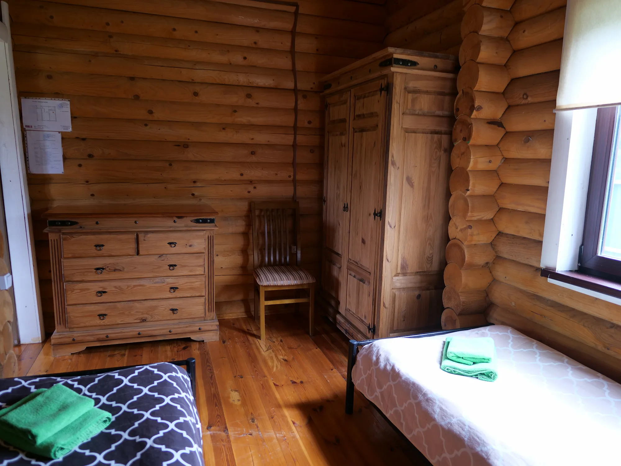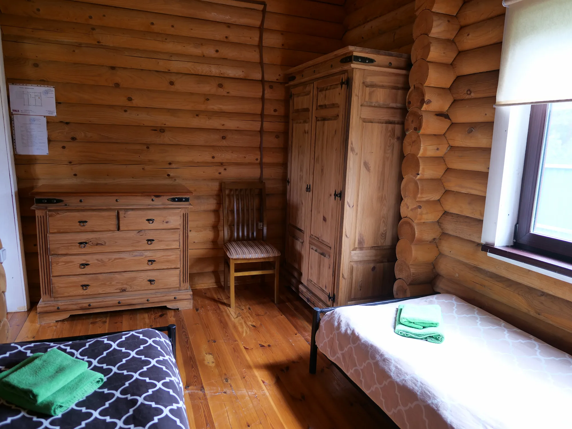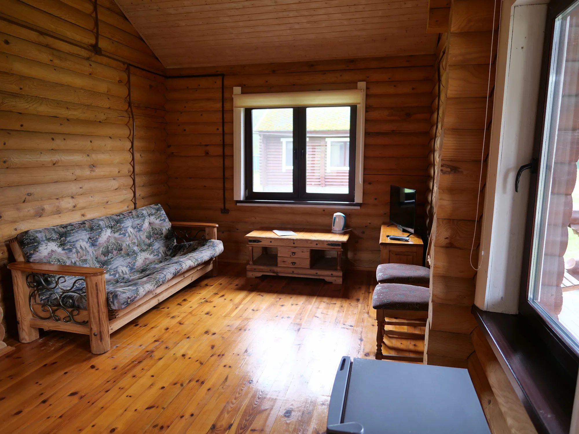 У катэджы два аднаспальныя ложкі, канапа, электрачайник, халадзільнік.