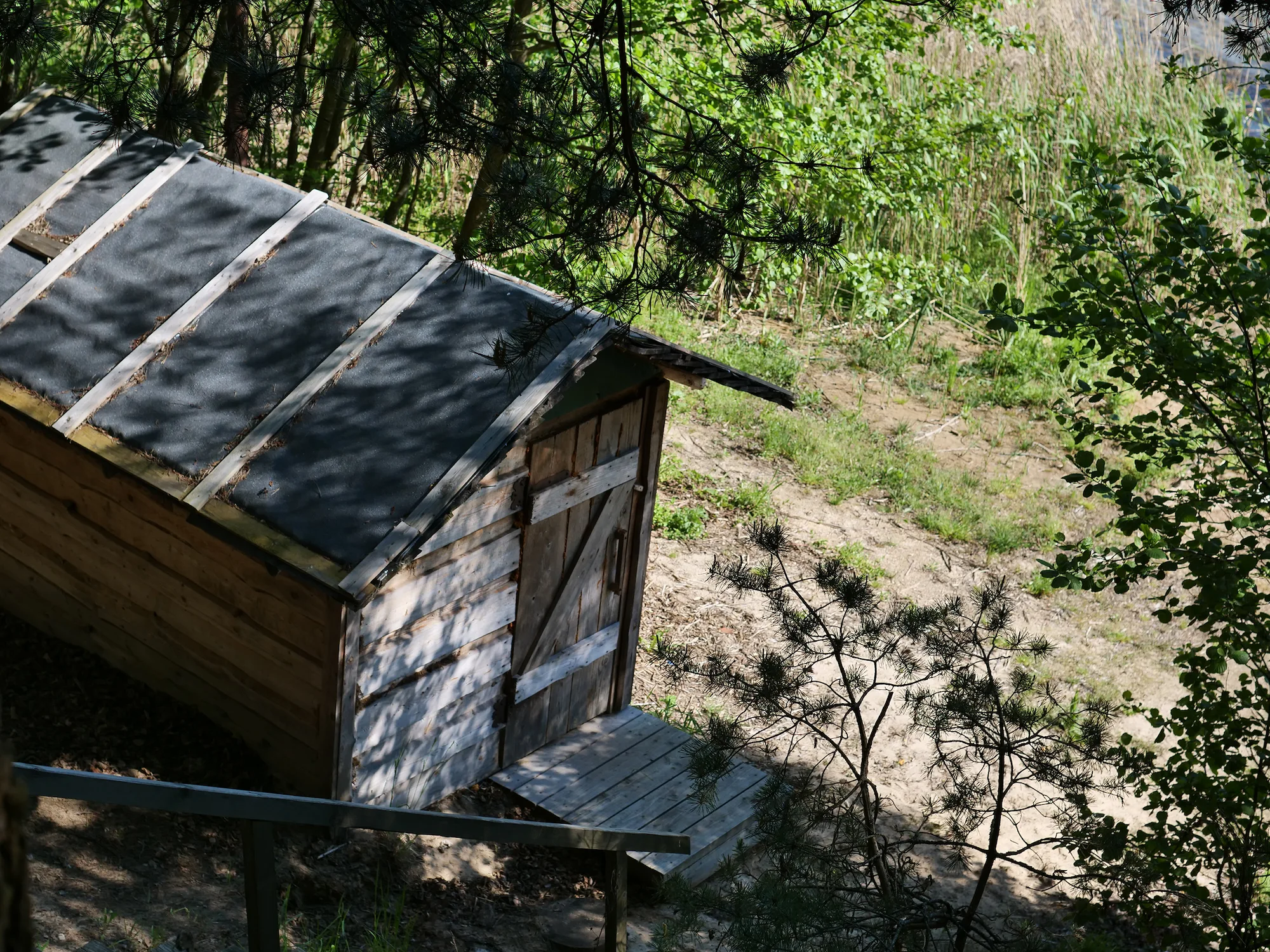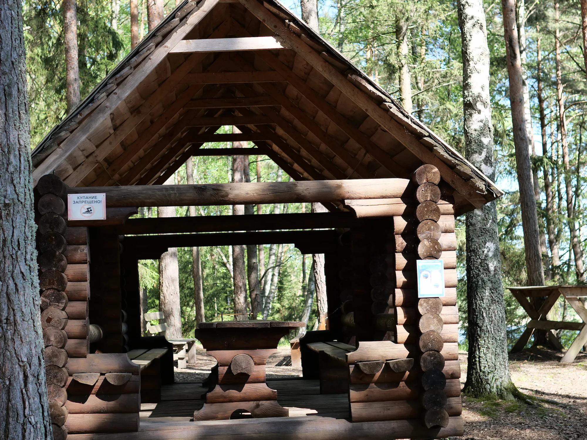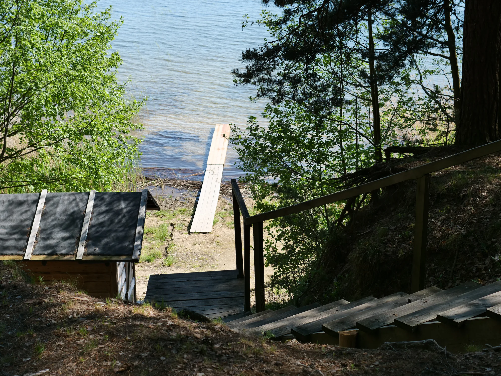 Equipped with a gazebo, toilet, fire pit with benches, waste disposal, firewood drying rack, firewood shelter, and firewood. A staircase leads to the water.