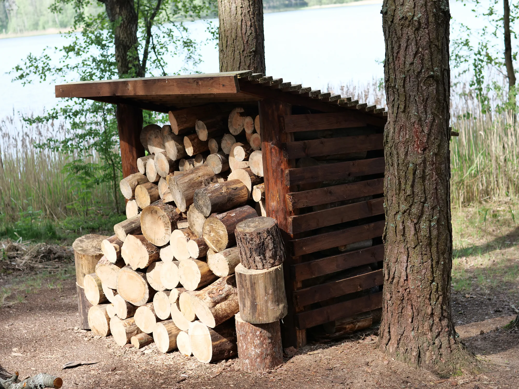 It is equipped with a gazebo, a water feature, a fire pit with benches, a toilet, a firewood dryer, a trash bin, a firewood shed, and a supply of firewood.
