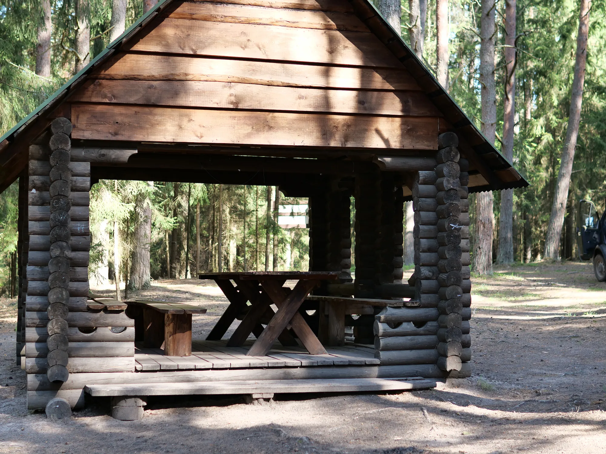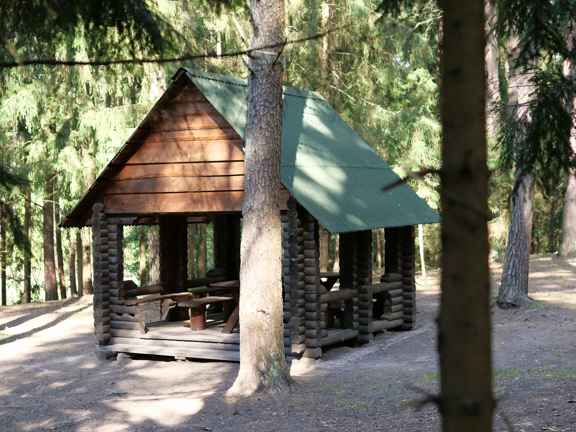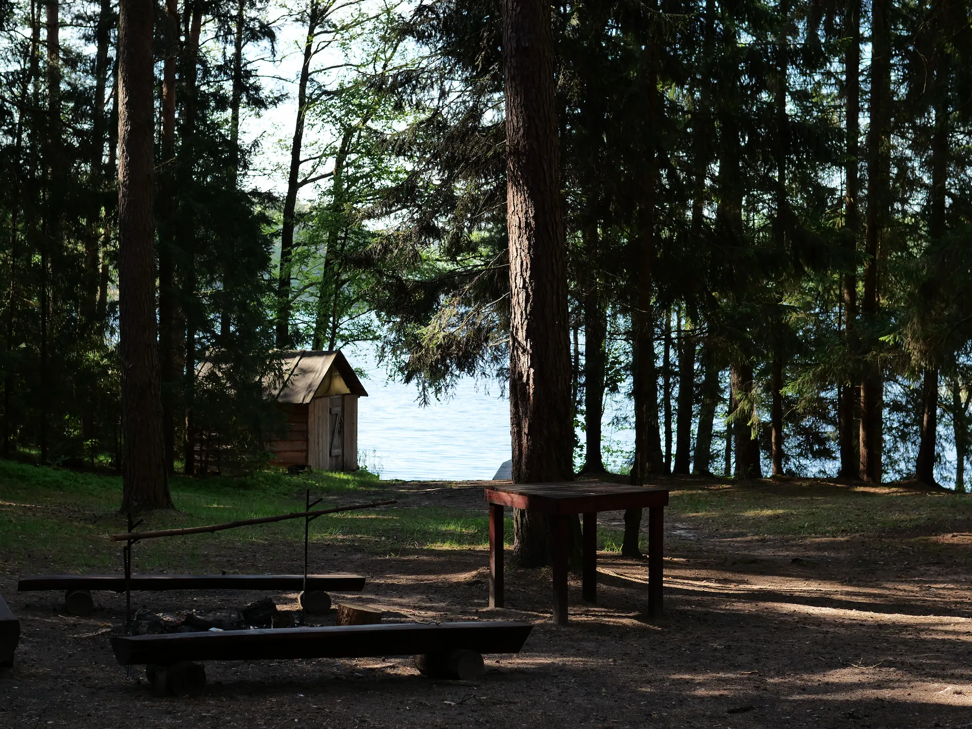 Equipped with a gazebo, a fire pit with benches, a toilet, a trash receptacle, a firewood shed, a firewood dryer, and firewood.