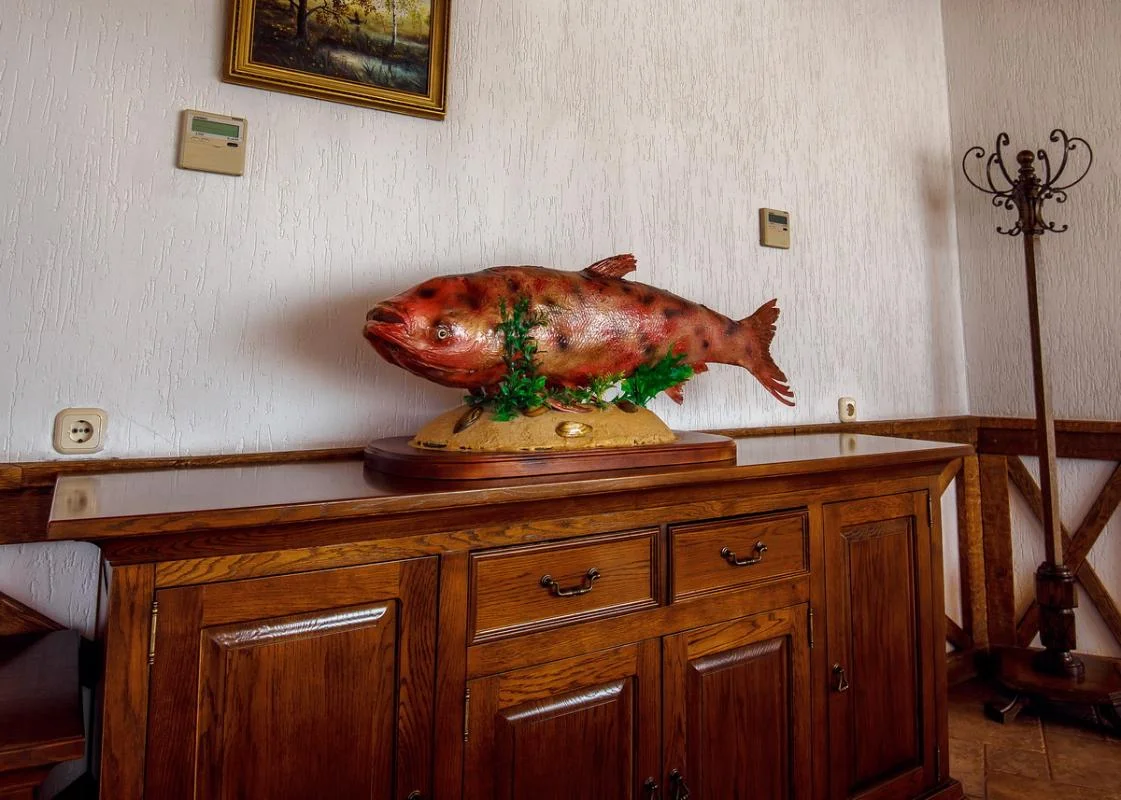 The restaurant «Over Pripyat» is decorated in the style of a cozy hunter’s house and is decorated in warm brown-beige colors with wood. There are three halls: the main hall, for 48 people, the fish hall, for 15 people and the Vip hall for 6 people, where you can retire with a small company.