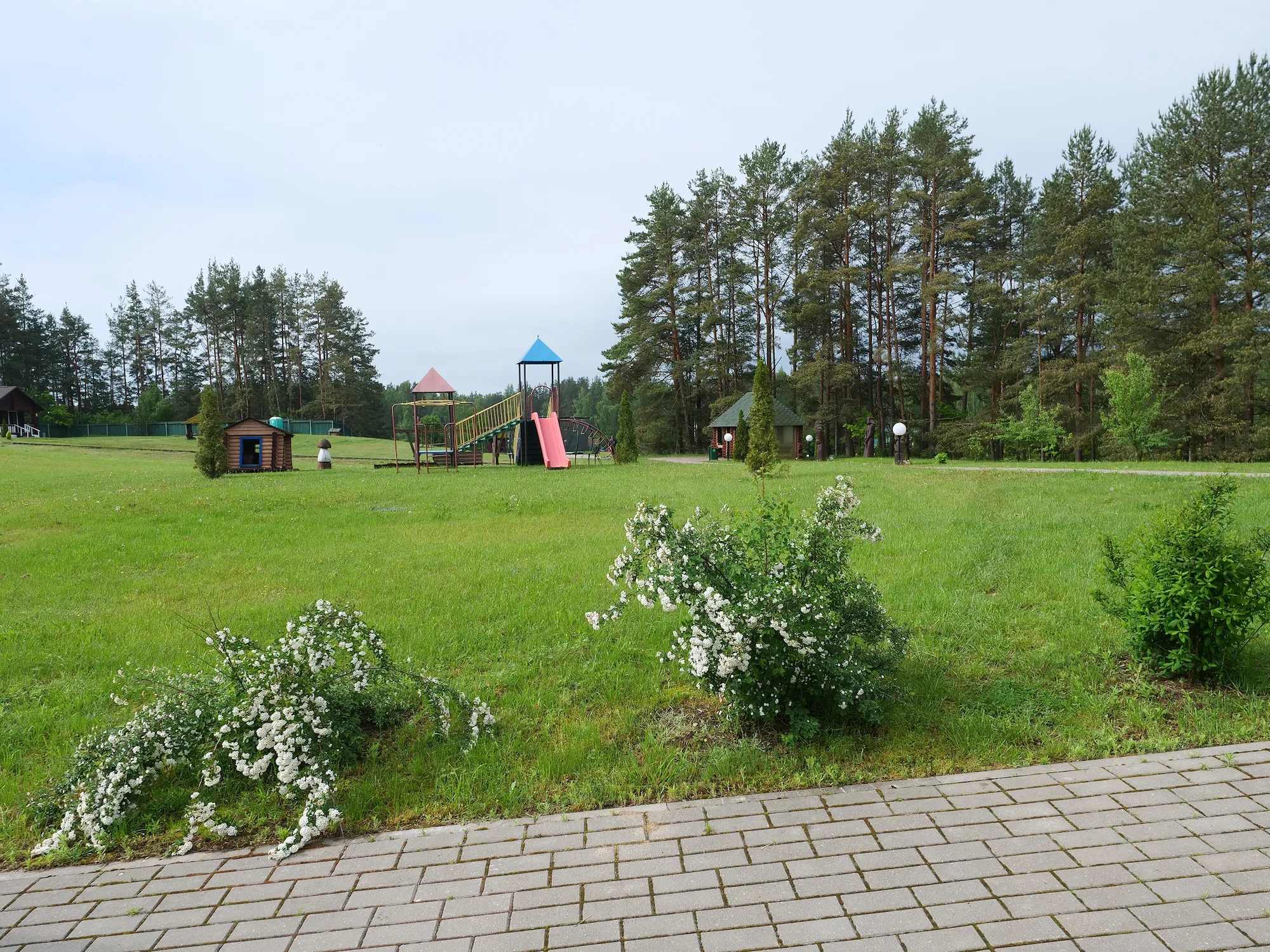 The grounds include two saunas, a dining room serving Belarusian home-style cuisine, a rental shop, two playgrounds, a trampoline, gazebos with barbecue areas, and parking.