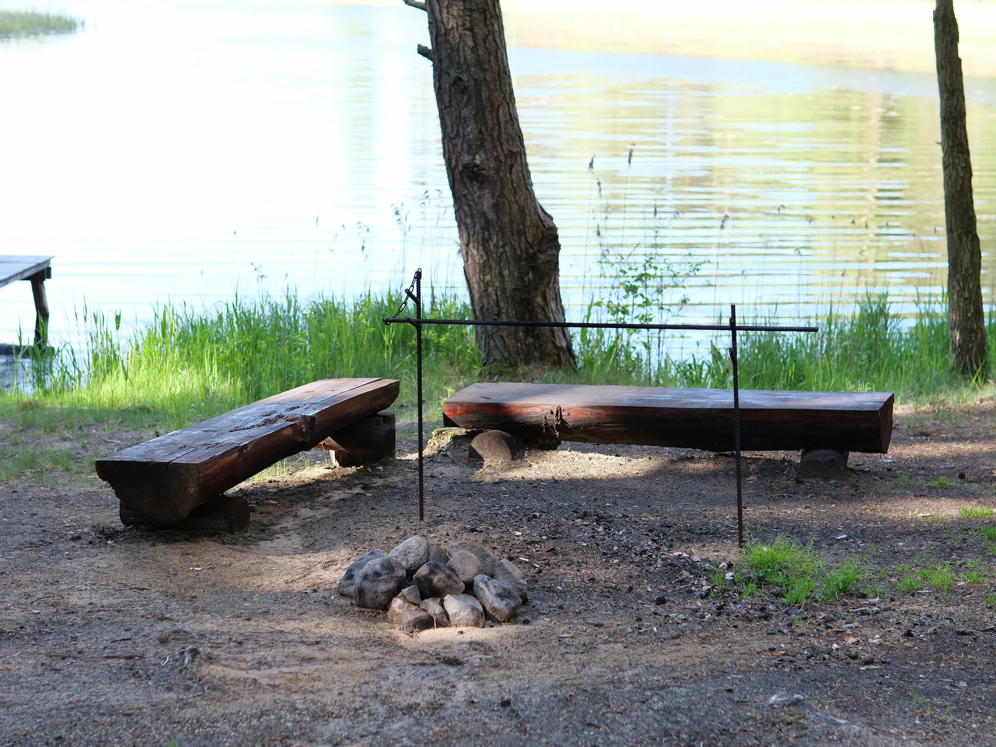 Оборудована навесом, кладкой к воде, кострищем с лавками, туалетом, мусоросборником, навесом для дров, дровами.