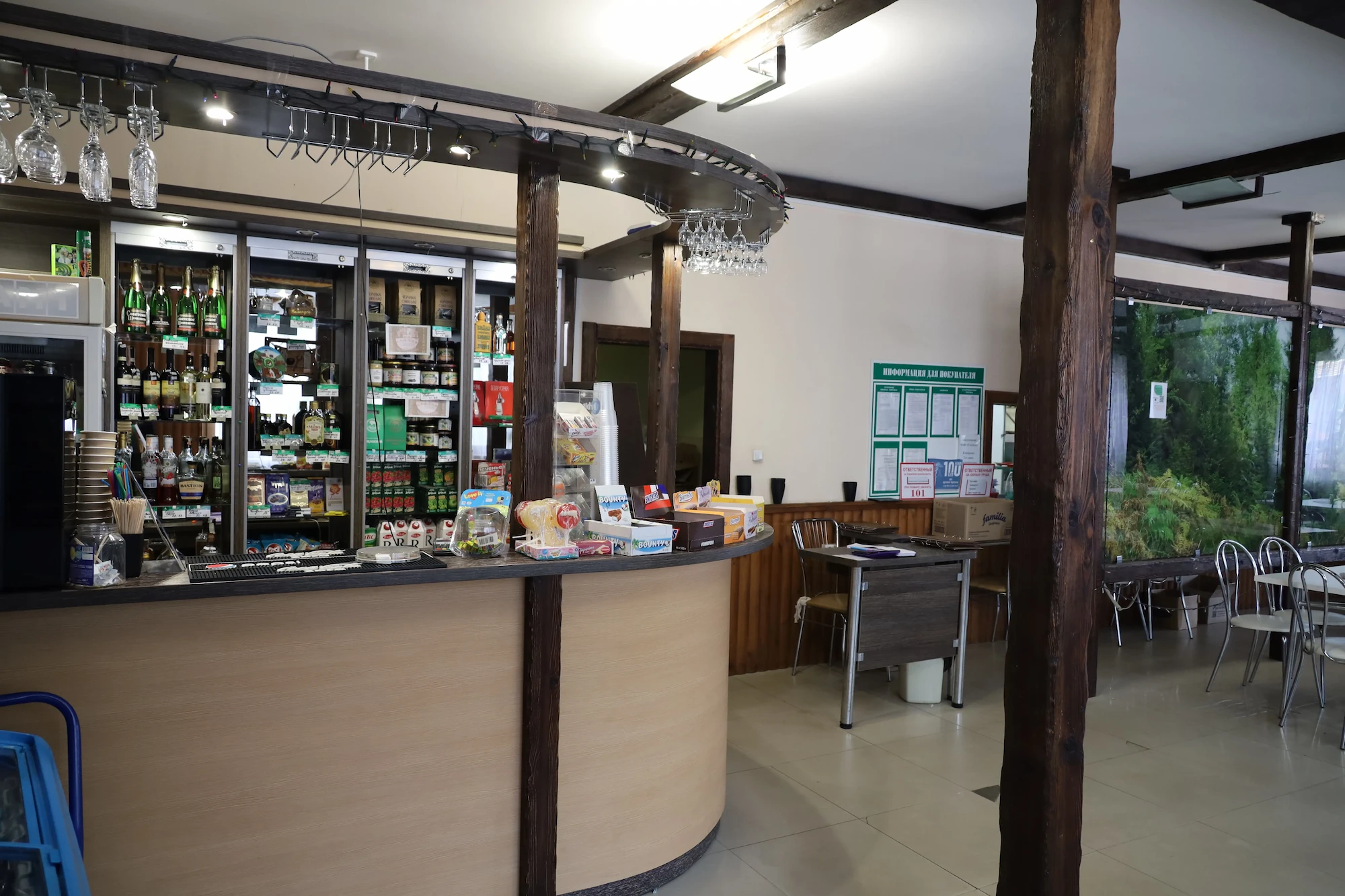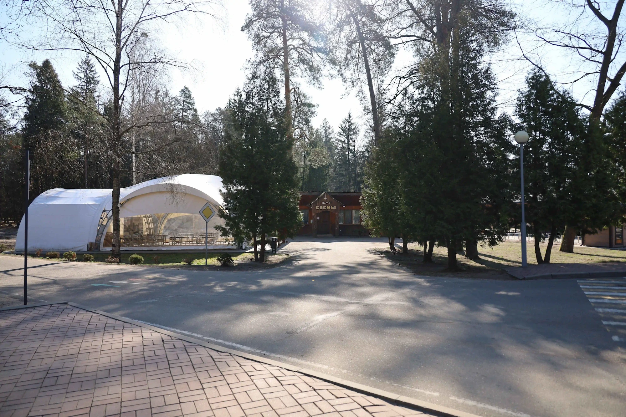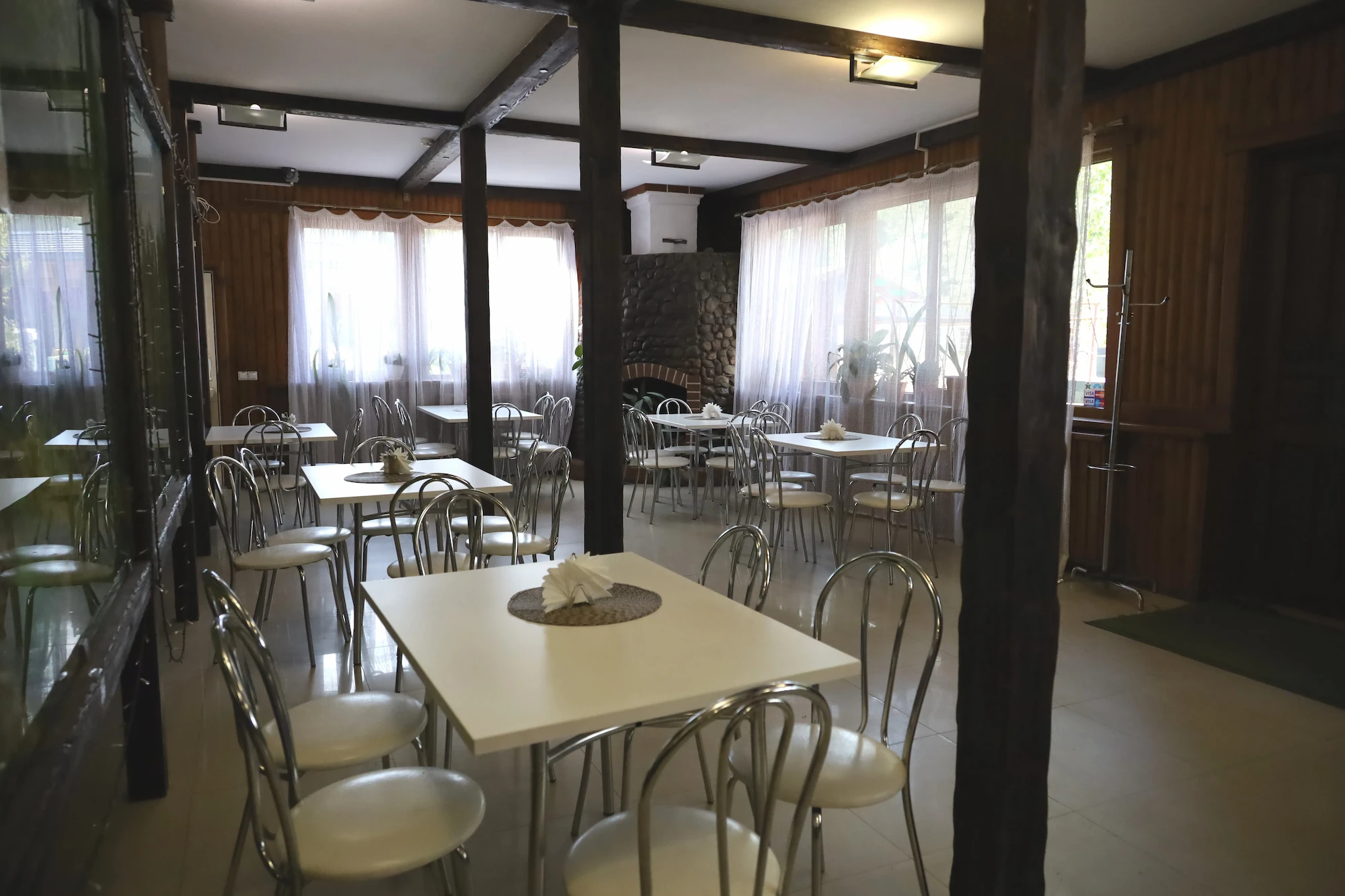 У кафе имеется открытая площадка на 50 посадочных мест, которая работает в течение всего года и привлекает туристов ароматным шашлыком, румяными пущанскими блинами и горячим травяным чаем.